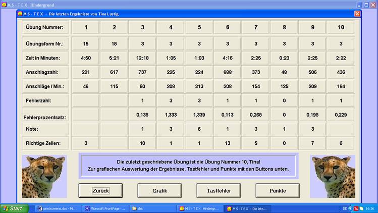 Wenn MS-TEX beendet wird, erscheinen zum Schluss nochmals alle Ergebnisse im Überblick.